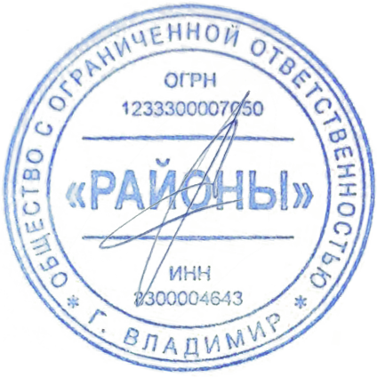 ООО "РАЙОНЫ" 600000,г.Владимир,ул.Стрелецкая,д.1,кв.6 ИНН 3300004643, КПП 330001001 |